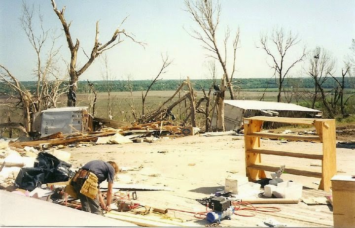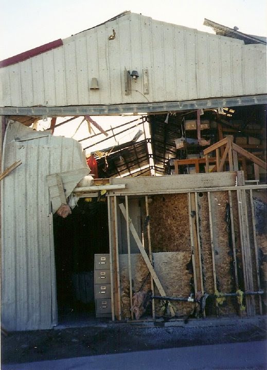 One of my departmental colleagues, Terry, lived just two blocks south of the auction complex, so I called him for a report. He had just watched the twister from his kitchen window and, by his estimate, the storm must have hit or come very close to the auction complex – as well as owner Ron Manion’s home, which was less that 1/10 of a mile to the southwest. Terry walked down the road to survey the situation, and about 20 minutes later called with the news that the building was gone. Ron’s house was narrowly missed, but had still sustained minor damage from blowing debris. We later learned Ron had witnessed the destruction of the auction complex from a safe room in the lower northeast corner of his house.